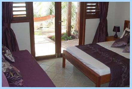 EL DORMITORIO TRES cuenta con baño en suite (con ducha) y puede ser armado con dos camas singles o una cama matrimonial. Una amplia ventana permite apreciar el jardín y el mar.