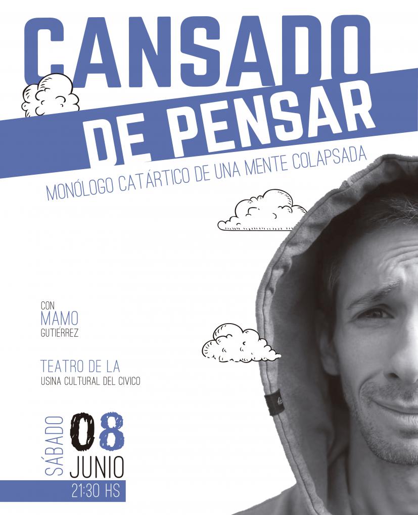 Cansado de pensar es el primer unipersonal de Mamo Gutiérrez: actor, comediante y monotributista de Bariloche. Luego de 33 años cuestionando obsesivamente lo incuestionable, este joven canoso decide escalar su propia maraña de pensamientos para lanzarse al vacío y compartir con el público sus fascinaciones, miedos y anhelos en un espectáculo que hace reír y pensar a la vez.