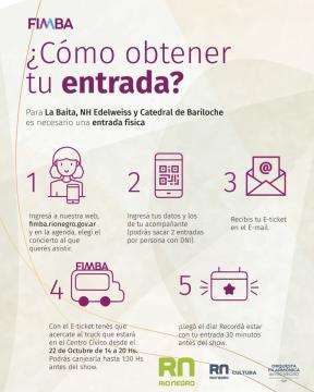 Para tener las entradas hay que seguir una serie de pasos sencillos, que garantizan el lugar en el show y el cumplimiento del aforo correspondiente. Primero hay que ingresar a la web fimba.rionegro.gov.ar, elegir el show y obtener el E – ticket. Luego hay que cambiarlo por la entrada física en el truck que estará ubicado desde mañana viernes 22 en el Centro Cívico. Podrán canjearse de 14:00 a 20:00 o hasta una hora y media antes del show. Para los shows a realizarse en el Camping Musical Bariloche y Estación Araucanía, sólo es necesario el E-ticket.