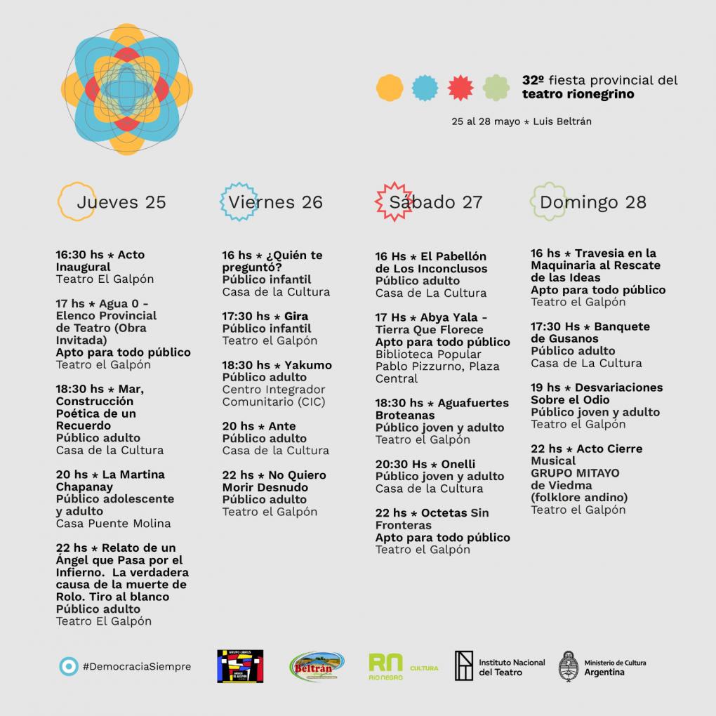 La 32ª Fiesta Provincial del Teatro Rionegrino es una coproducción organizada por el Instituto Nacional del Teatro, la Secretaría de Estado de Cultura, la Municipalidad de Luis Beltrán y la Asociación Cultural Grupo Libres de dicha localidad.
