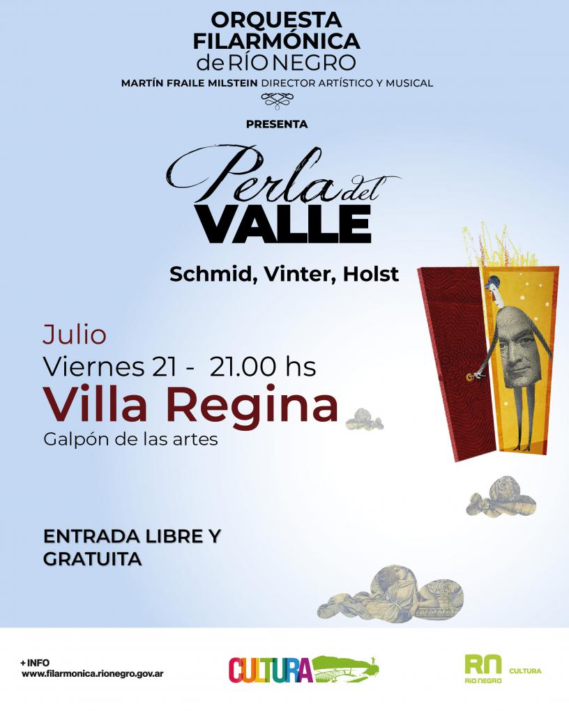 El ensamble de la Filarmónica de Río Negro Perla del Valle se presentará este viernes 21 de julio a las 21 en el Galpón de las Artes de Villa Regina con entrada libre y gratuita.