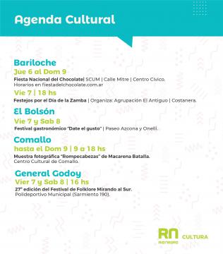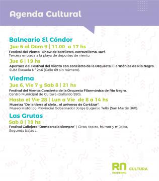 Conciertos de la Filarmónica de Río Negro en el marco del Festival del Viento en Viedma, el Festival Callejero “Democracia siempre” en Las Grutas, el Festival de Folklore Mirando al Sur en General Godoy y la Fiesta Nacional del Chocolate en Bariloche resaltan entre las actividades que organiza y acompaña la Secretaría de Estado de Cultura.