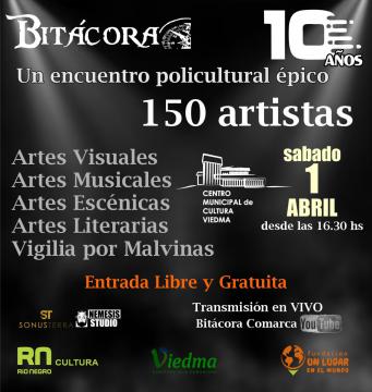 La Agenda Cultural “Bitácora” de Viedma y Patagones cumple 10 años de acompañamiento a la difusión de la cultura local y lo celebra este sábado 1º de abril con un gran encuentro artístico en el Centro Municipal de Cultura a partir de las 16.30 con entrada libre y gratuita.