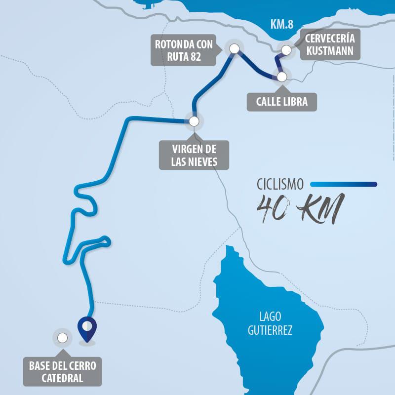 CICLISMO: 40 km, por calle Libra subiendo hacia Pioneros, Ruta Provincial 82 y camino hacia Cerro Catedral. Retome por el camino de ingreso al Balcón del Gutiérrez.