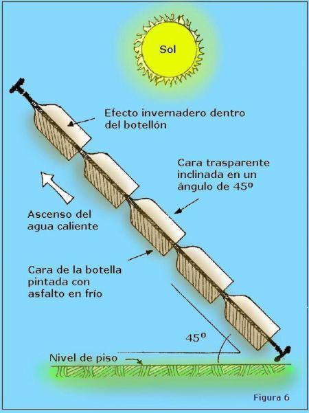 Se trata de aprovechar la energía solar que no tiene costo y utilizar botellas de gaseosas que se tiran a la basura. La idea, en términos simples, consiste en crear un pequeño invernadero en cada botella y pasar por dentro de la misma una manguera de riego (polietileno). De esta manera, el calor que queda atrapado en la botella y que luego es absorbido por la manguera (que es negra) se transfiere al agua y así se puede calentarla y ahorrar combustible como gas, electricidad o leña.