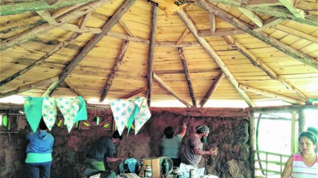 El comienzo de la construcción del espacio de reunión fue en la primavera del año 2015, con el asesoramiento de un bioconstructor local, pero por diferentes causas no fue finalizada en ese momento. Actualmente, la estructura está completa, el techo montado y algunas paredes en pie.