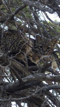 El gato montés de las fotos (Leopardus geoffroyi) se paseaba tranquilamente en un bosque de añosos cipreses, en la zona sur del Parque Nacional Lanín. Las fotos fueron tomadas por Mariano Huergo, pocos días antes de que empezara a regir el aislamiento social obligatorio.