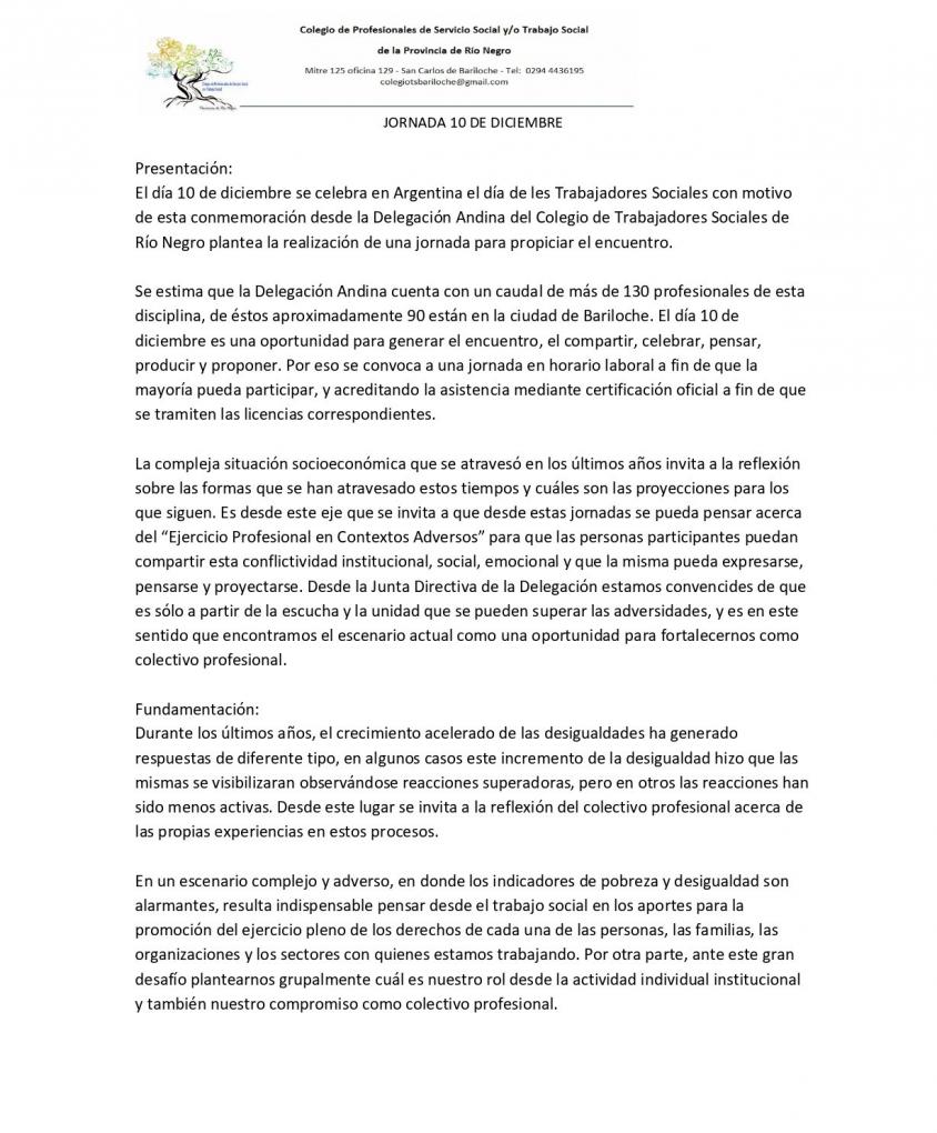 El Colegio de Trabajadores Sociales de Río Negro - Delegación Zona Andina, adhiere al ...