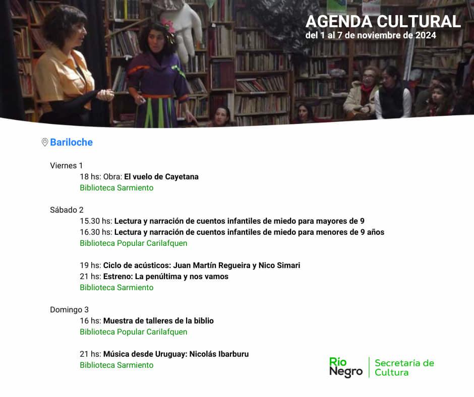 Sábado 2 15.30 hs: Lectura y narración de cuentos infantiles de miedo para mayores de 9 Biblioteca Popular Carilafquen 16.30 hs: Lectura y narración de cuentos infantiles de miedo para menores de 9 años 19 hs: Ciclo de acústicos: Juan Martín Regueira y Nico Simari 21 hs: Estreno: La penúltima y nos vamos Biblioteca Sarmiento