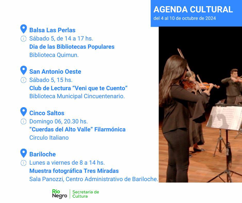 Cinco Saltos Domingo 06, 20.30 hs. "Cuerdas del Alto Valle" Filarmónica Circulo Italiano Bariloche Lunes a viernes de 8 a 14 hs. Muestra fotográfica Tres Miradas Sala Panozzi, Centro Administrativo de Bariloche.