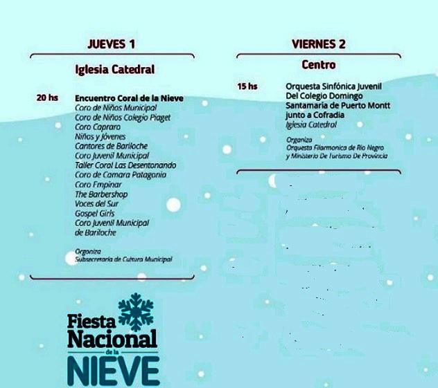Encuentro Coral de la Nieve (Coro de Niños Municipal, Coro de Niños Colegio Piaget, Coro Capraro, Niños y Jóvenes Cantores de Bariloche, Coro Juvenil Municipal, Taller Coral Las Desentonando, Coro de Cámara Patagonia, Coro Empinar, The Barbershop, Voces del Sur, Gospel Girls, Coro Juvenil Municipal de Bariloche)