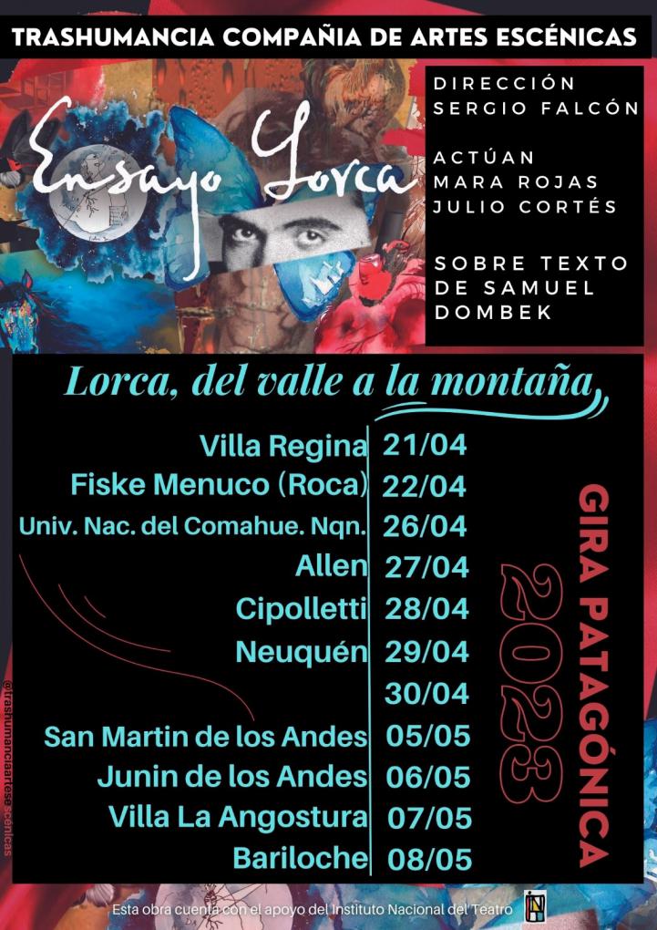 Trashumancia compañía de artes escénicas es un grupo cuyos integrantes están radicados en la ciudad balnearia bonaerense de Villa Gesell. Desde el 21 de abril con función en Villa Regina, iniciaron una gira con su obra Ensayo Lorca. Recorrieron escenarios de FiskeMenuco, Allen, Cipolletti, el Aula Magna de la Universidad del Comahue y TeNeAs en Neuquen capital. En la segunda etapa de ésta gira denominada Lorca, del valle a la montaña; se presentaran este viernes 5 en San Martin de los Andes, el sábado 6 en Junín de los Andes, domingo 7 en Villa La Angostura para concluir el lunes 8 en nuestra ciudad.