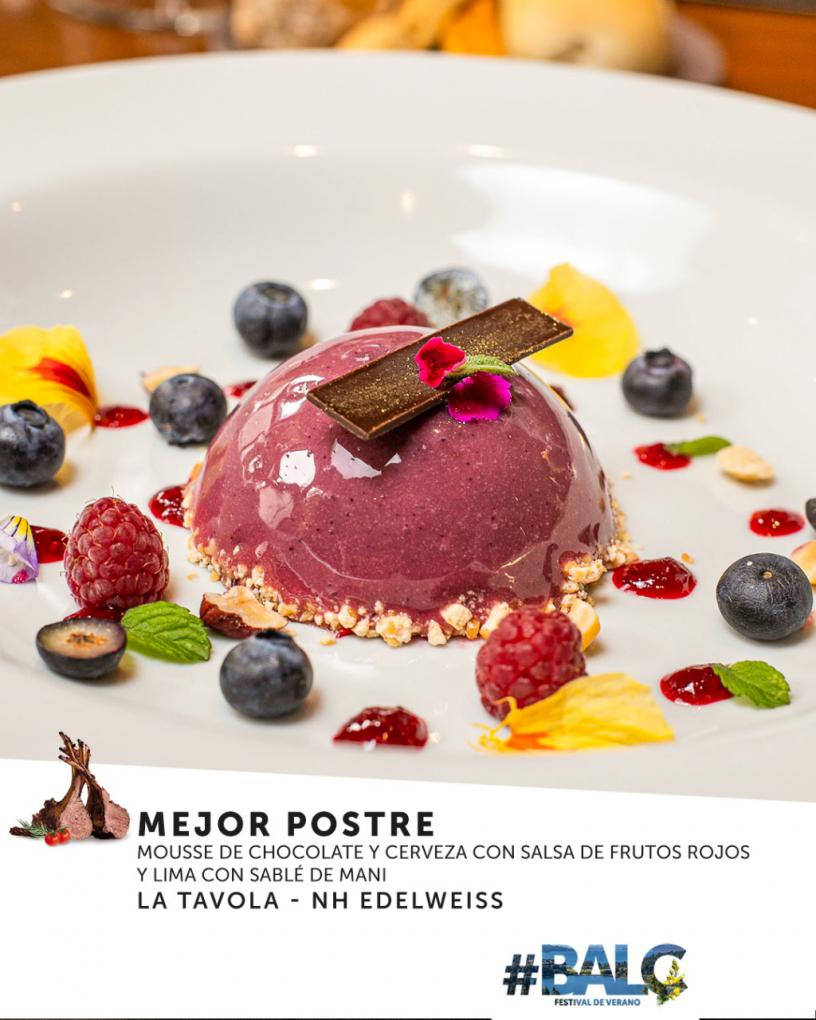 La Mejor Entrada, fue para “Batistin – Huinid Hoteles”, con su trucha patagónica curada en sauco, buñuelo de mandioca & queso de cabra, ensalada de vinagrillo, crema ácida. En tanto, el premio de Mejor Postre fue el restaurant “La Tavola - NH Edelweiss”, con su mousse de chocolate y cerveza con salsa de frutos rojos y lima con sablé de mani.
