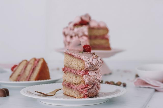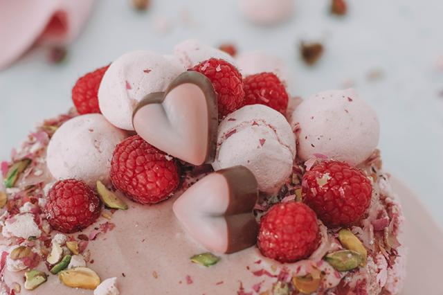 Decorar con merengues triturados, pistachos, frambuesas, pétalos de rosas y bombones en forma de corazón.