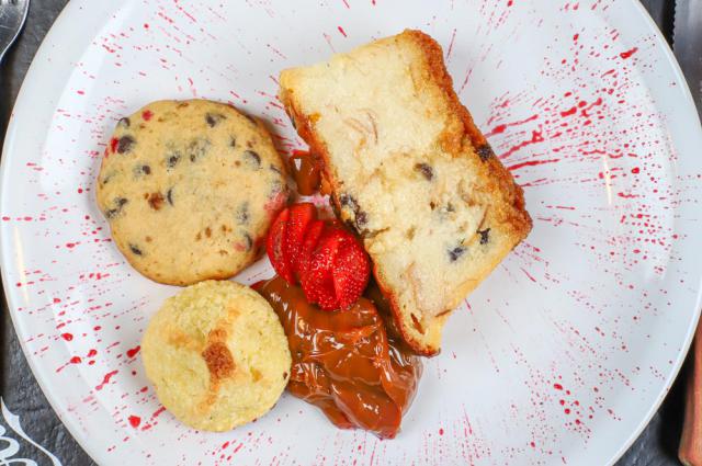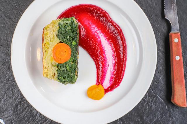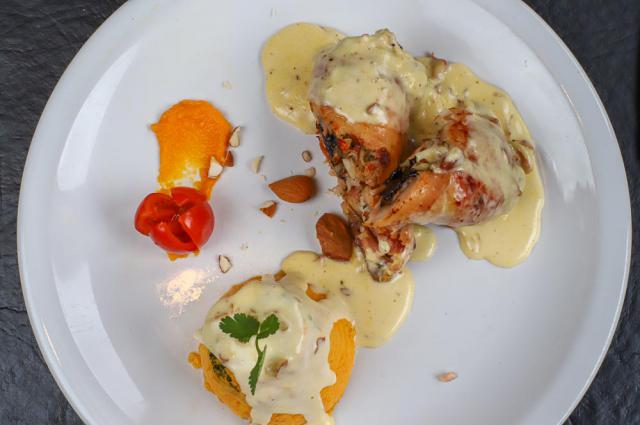Roll de pollo relleno con crema al cognac y flan de zanahorias y brócoli.