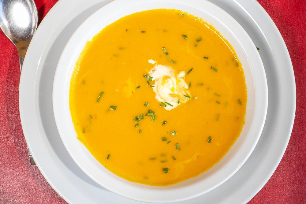 Sopa de zanahorias, curry y tomillo, con croutons y lagrima de crema.