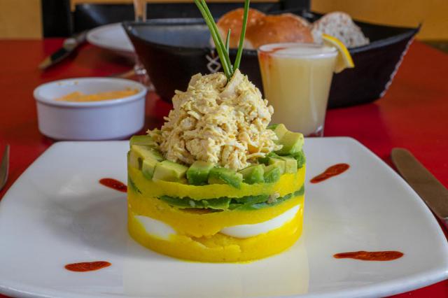 Causa peruana de pollo, palta, huevo y tomate. Con chupito de pisco souer.*