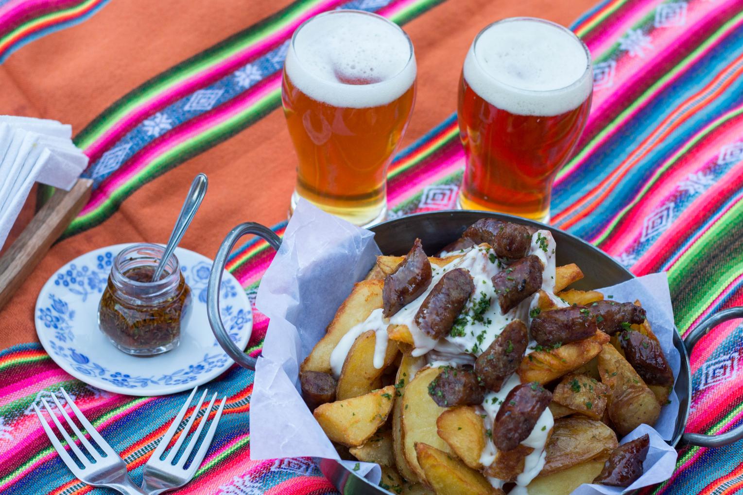 Papas rústicas con fondue de queso, salchi ...