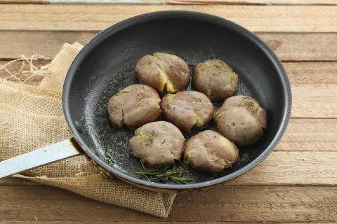 Para la guarnición: lavar los papines y hervirlos en abundante agua, hasta que estén tiernos pero sin que se deshagan. Escurrirlos y dejarlos enfriar. Luego, aplastarlos con la palma de la mano y dorarlos en manteca con romero, en una sartén caliente. Cuando estén bien dorados, condimentar con sal y pimienta, para presentar junto al lomo.
