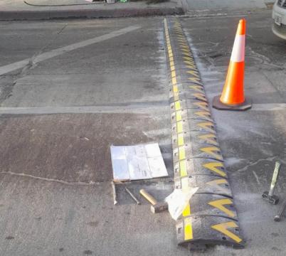 Personal de Señalización de Tránsito y Transporte estará instalando reductores de velocidad “de anclaje”, los que fueron donados por un comerciante de las inmediaciones, debido al exceso de velocidad de los automovilistas.