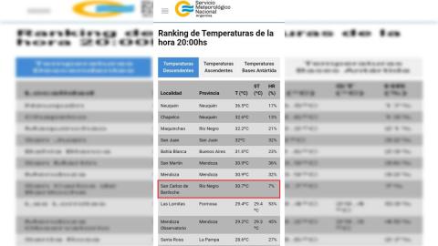 El Servicio Meteorológico Nacional (SMN) sorprendió con los datos aportados en esta jornada. Es que si bien la capital de Neuquén lideró el listado con 36,5 grados, Bariloche quedó en el puesto 8 con una temperatura de 30,7 grados cuando el sol comenzaba su retirada.