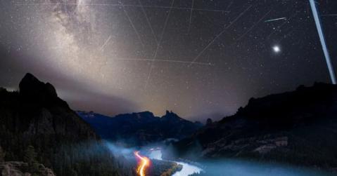 La foto, tomada el 4 de mayo en cercanías del río Limay, captura en una sola escena la magia del cielo patagónico: la Vía Láctea en su sector norte, el resplandor del planeta Venus, un “trencito” de satélites Starlink, dos meteoros de la lluvia Eta Acuáridas —provenientes del famoso cometa Halley— y decenas de satélites cruzando la bóveda celeste.