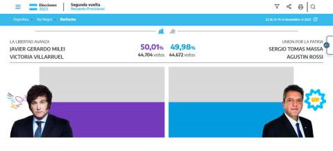 La escasa diferencia entre ambos fue de apenas 32 votos. El líder de La Libertad Avanza (LLA) sumó 44.704 voluntades y el candidato de Unión por la Patria (UxP) reunió 44.672 votos con los datos de las 22,36h del domingo.