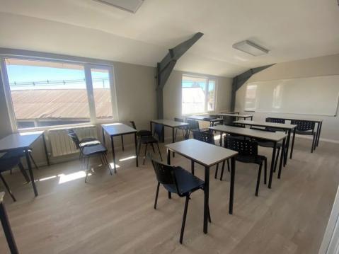 El centro de formación profesional, consta de 6 aulas, un espacio de cuidados infantiles para quienes estudien en el espacio, oficinas, y, en el piso de abajo, las oficinas de la Delegación con Mesa de Entradas para realizar trámites y licencias de conducir.