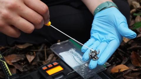 Los investigadores de la ONG Ranita de Darwin, Bastián Santana y Claudia Faure, realizaron un chequeo minucioso de las ranitas encontradas para determinar su estado de salud, información que será clave para la protección de la especie en el lugar.