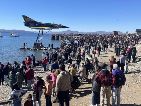 El momento más esperado llegó cuando dos aviones de la Fuerza Aérea Argentina sobrevolaron el Nahuel Huapi, frente al Memorial.