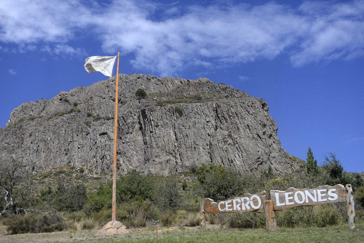 Al dejar atrás la localidad de Dina Huapi, transitando un kilómetro por la Ruta 23 que abre el camino hacia la estepa y la Línea Sur, se accede al cerro Leones, de 987 metros de altura.