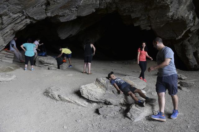 La segunda caverna ofrece pinturas rupestres. La gente se agacha para verlas mejor mientras el guía las ilumina con una linterna.