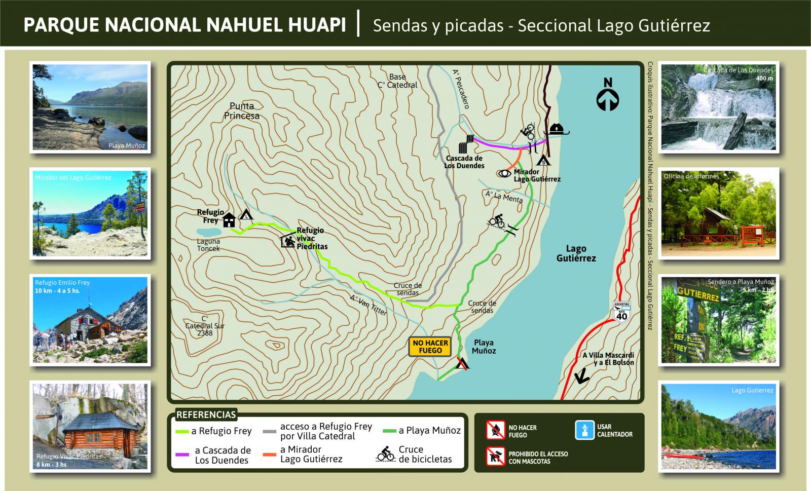 A pocos metros de la seccional Lago Gutiérrez atravesando un bosque de coihue, comienzan una serie de sendas y picadas con distintos niveles de dificultad y distancias.