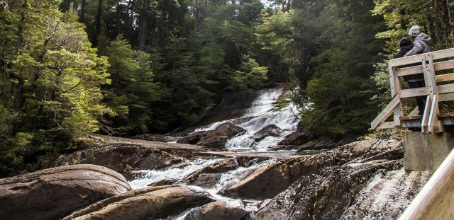 Atravesando la frondosa vegetación de la selva valdiviana, se accede al nacimiento de la cascada, en el lago Cántaros, donde se puede apreciar un milenario alerce, de más de 1500 años.