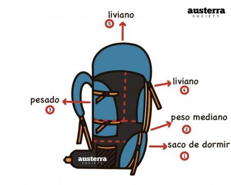 Próximo al CG, se deben ubicar los elementos más pesados, como los termos, agua, calentador y alimentos. A la misma altura de la mochila, pero lejos de la espalda, debemos ubicar el peso ligero: ropa, botiquín, artículos de higiene, abrigo. En la parte superior de la mochila ubicamos las cosas frágiles y documentación.