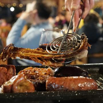 En salón ambientado con motivos gauchescos, el menú es parrillada (empanadas, asado y cordero al asador, chorizos, morcilla, achuras) acompañada de ensaladas o papas fritas, pan, tortas fritas, y un postre. Hay opciones para pasajeros veganos, vegetarianos y celíacos.