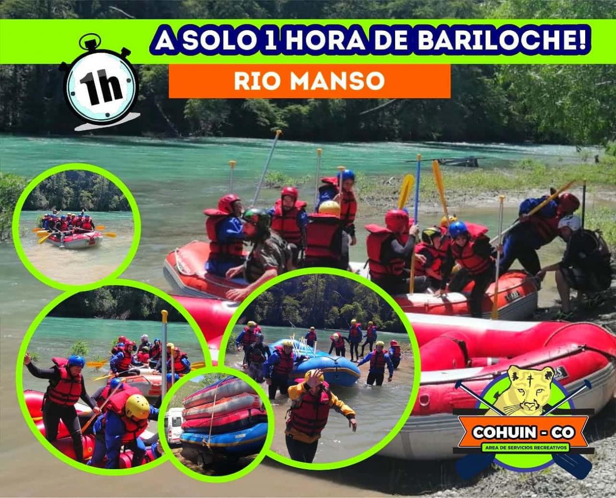 Te esperamos en el camping Cohuin-Co, un lugar que vale la pena conocer! Ubicado en la confluencia de los ríos Manso y Villegas, lugar donde nos equiparemos para la navegación y tras una charla técnica de seguridad, estamos listos para comenzar a navegar los 8 km de recorrido. En la primer parte la serenidad del rio nos permite disfrutar del paisaje y su vegetación exuberante, donde se imponen las bellezas del cerro Bastión y el cerro El Ventisquero.