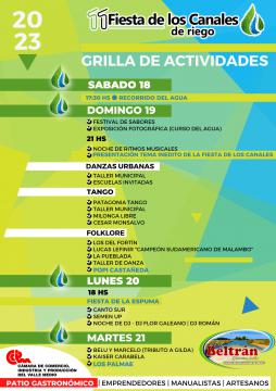 En el marco del fin de semana largo, el 19, 20 y 21 de febrero Luis Beltrán celebrará una nueva edición de la Fiesta Provincial de los Canales de Riego con una amplia agenda de propuestas que incluye actividades culturales, turísticas, recreativas y una tentadora intervención culinaria que llevará adelante el Ministerio de Turismo y Deporte.