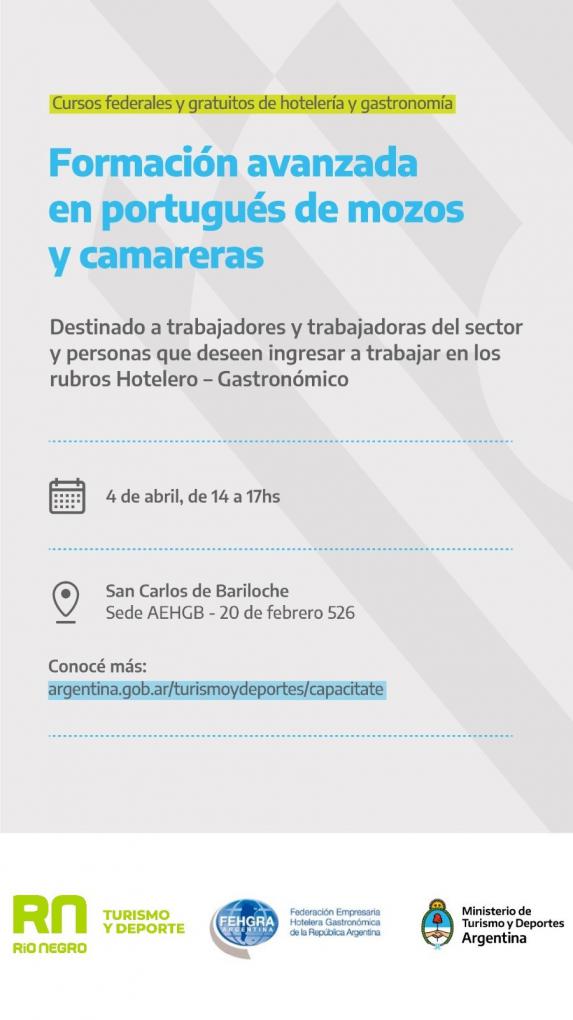 Con el objetivo de profesionalizar aún más el servicio hacia los turistas, el próximo martes 4 de abril se llevará adelante en Bariloche el primer encuentro de una capacitación intensiva para mozos y camareras de los sectores gastronómicos y hoteleros de la Región Andina, que incluirá el idioma portugués.