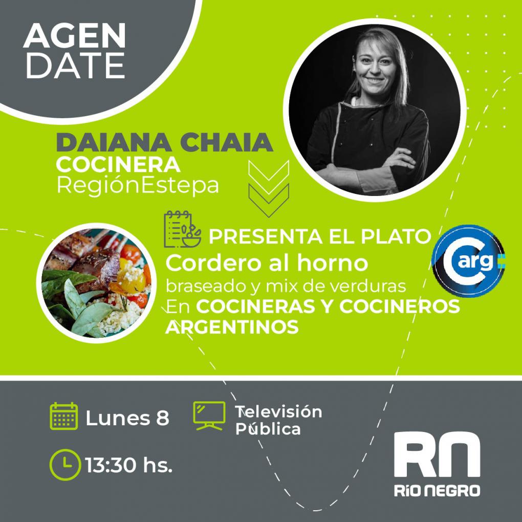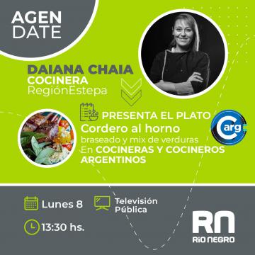 La chef rionegrina Daiana Chaia presentará, el próximo lunes en el programa Cocineras y Cocineros Argentinos de la TV Pública, una receta con productos locales representativos de la Región Estepa de Río Negro. Durante la emisión, se promocionará la localidad, sus atractivos principales y los sabores que caracterizan a la Región Sur provincial.